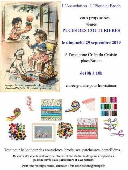 Agenda de septembre, la suite encore Publié le 8 septembre 2019 par vava Publicité Merci France pour cette annonce en plus pas très loin de chez moi..... Puces de couturières Le Croisic le 29 septembre Peut-être une idée de sortie pour me faire plaisir après le week-end de mariage A bientôt Vava Publicité